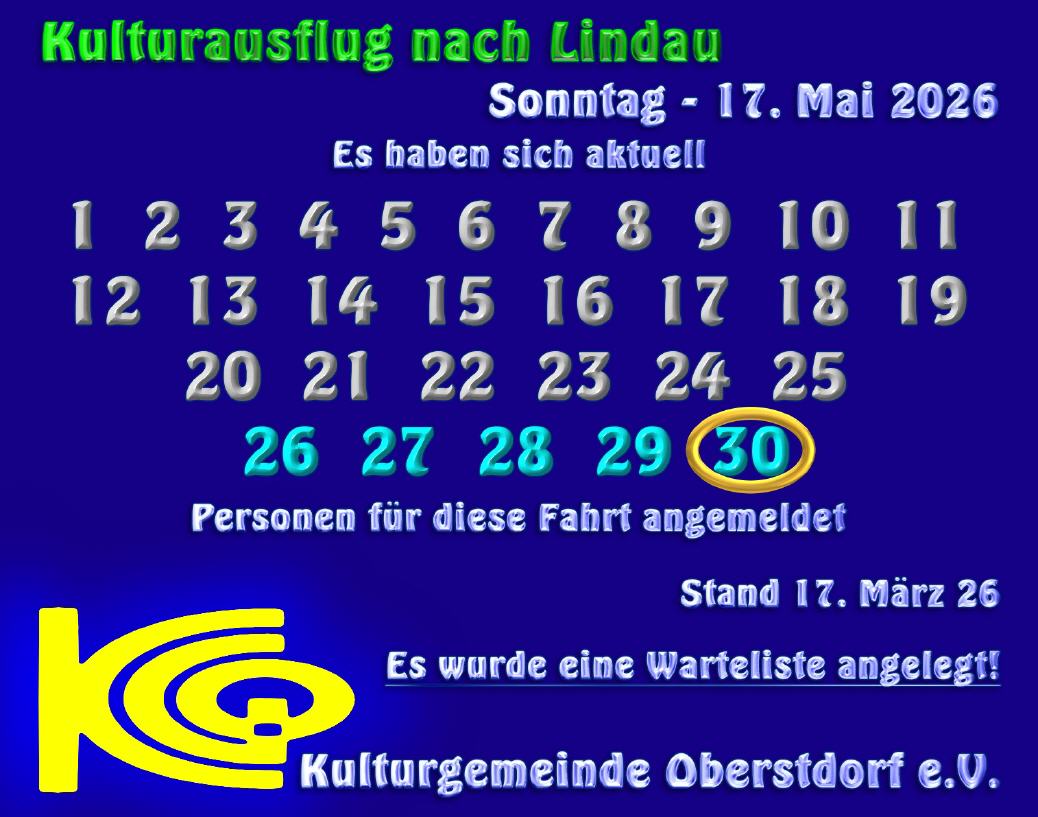 Am Samstag, den 14. März 2026 hatten wir einen Kulturausflug nach Lindau im Bodensee ausgeschrieben: Am Sonntag, den 17. Mai 2026 lassen wir nach einigen Jahren die Tradition der kulturellen Tagesausflüge wieder aufleben und unternehmen eine Fahrt zur Lindauer Marionettenoper und zum Museum Cavazzen zur aktuellen Picasso-Ausstellung. Was zunächst als Versuchsballon gedacht war mit der Frage, ob dieses Angebot überhaupt wieder gewünscht wird, hat zu unserer großen Freude richtig gut "eingeschlagen". Bereits heute, am 17. März, haben sich 30 Personen angemeldet. Herzlichen Dank für Ihr Interesse.